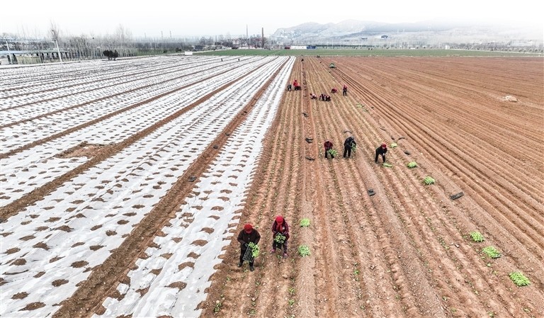 2月6日,济源示范区克井镇北樊村村民在田间栽植白菜苗。苗秋闹 摄