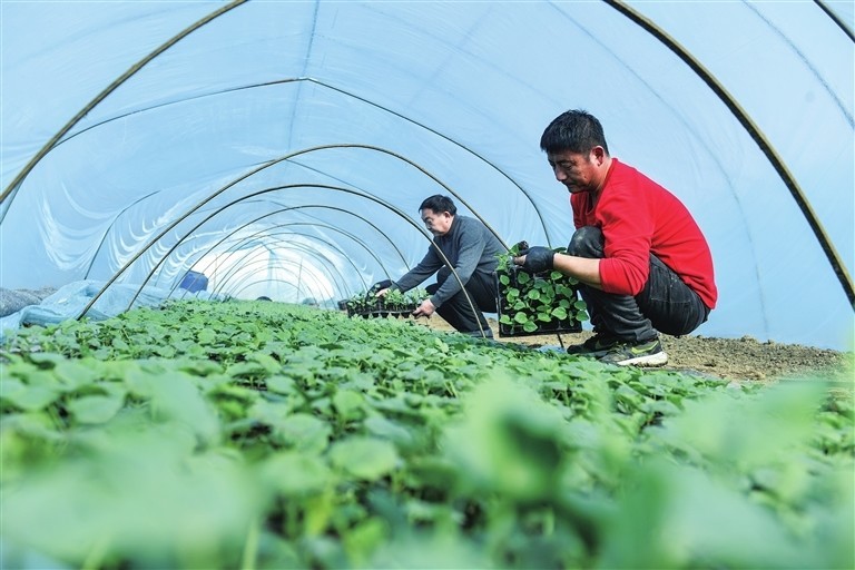 图③ 2月4日,夏邑县郭店镇何集村村民在管理准备移栽的西瓜秧苗。苗育才 摄